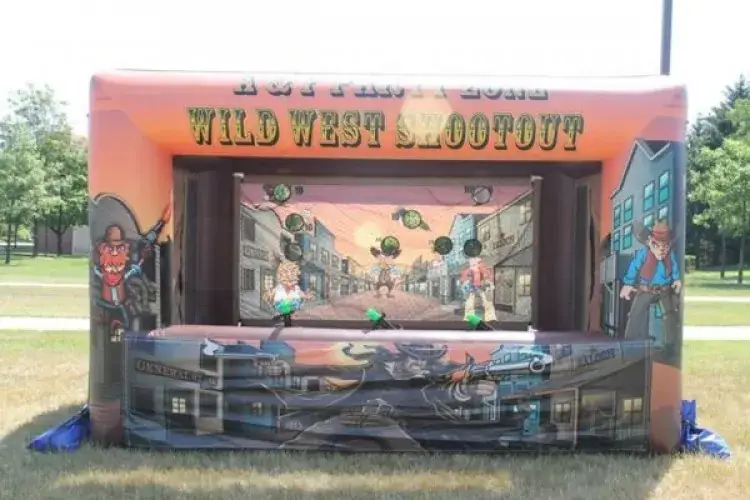 The shooting gallery has 2 lanes and five random targets on each side. Participants shoot the illuminated targets to score on the digital scoreboard. Very competitive.