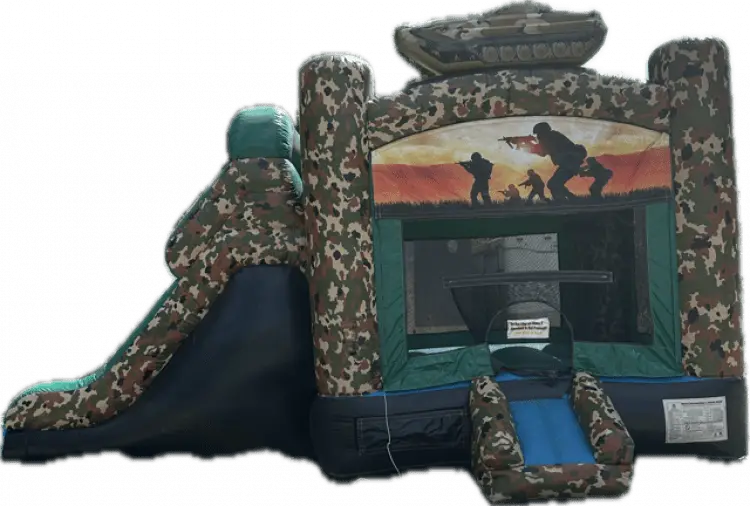 The Camo Combo is the ultimate inflatable adventure experience, blending a classic bounce house with an exhilarating slide. Designed with a camouflage pattern, it's perfect for aspiring adventurers eager to immerse themselves in the thrill of the outdoors while enjoying the safety and fun of a giant inflatable. Ideal for both parties and events, this rental keeps the energy levels high and the smiles even higher. Add a Camo Combo to your next event